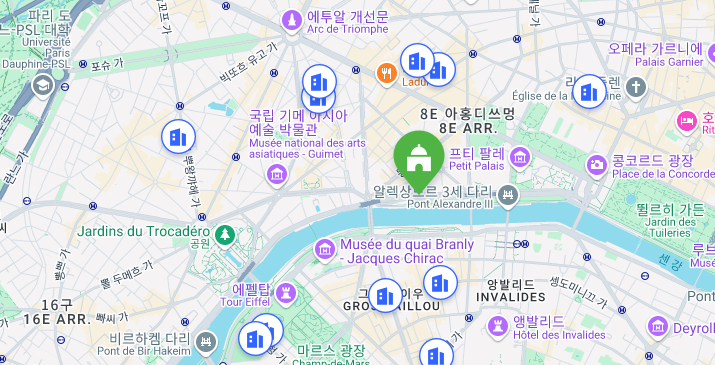 - RER: 가장 가까운 RER 역은 RER C 노선의 Pont de l'Alma이다. 에펠탑이나 베르사유에서 이동하는 경우, RER을 이용하는 것이 편리할 수 있음!