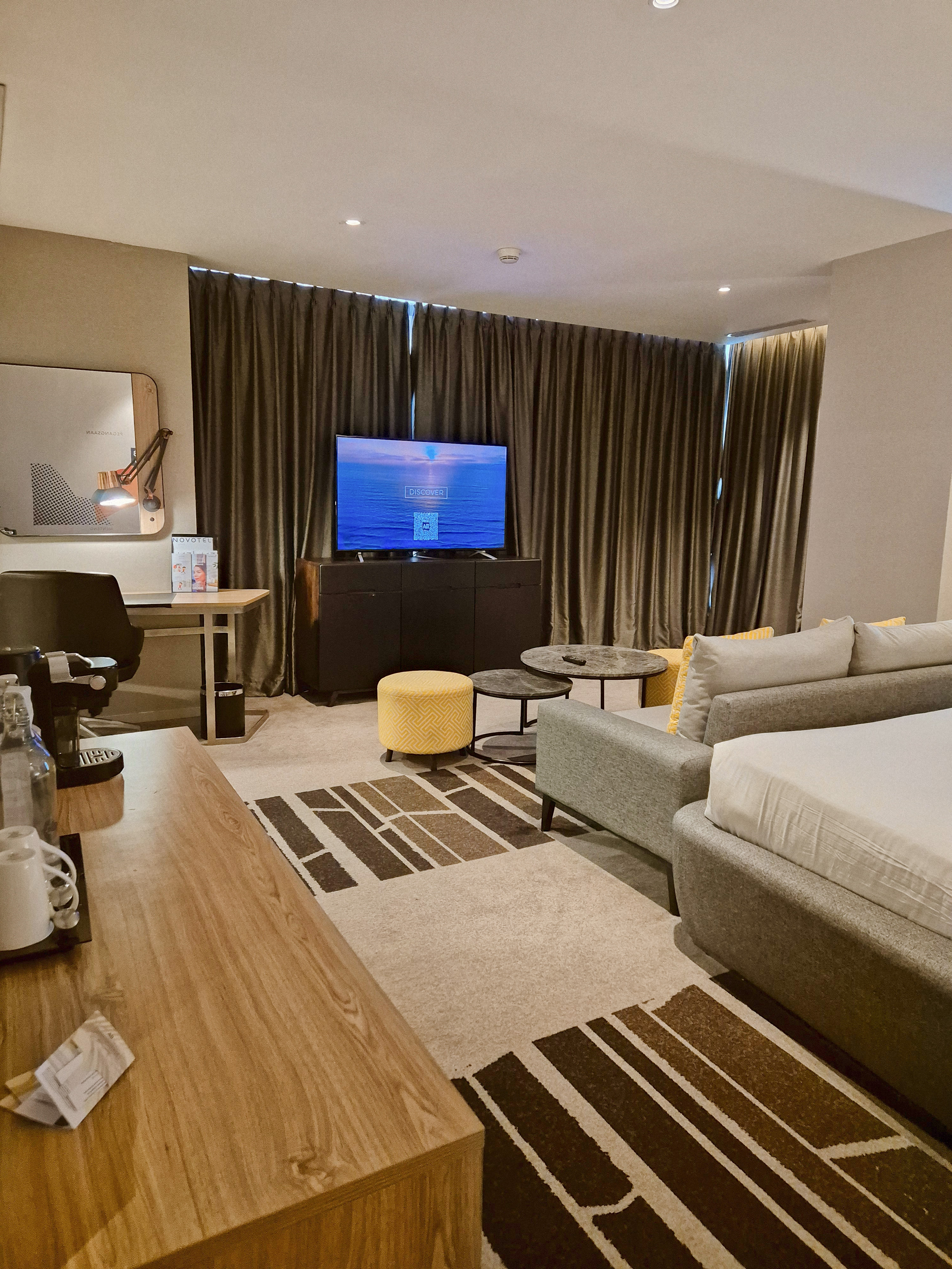 노보텔 자카르타 치키니 (Novotel Jakarta Cikini)  갑자기 자카르타에 가게 되면서!숙소가 생각보다 저렴해 여기저기 욕심을 내다가 적정선에 타협하자는 마음으로 선택한 곳이다.아무래도 한국보다 숙박료가 저렴하다보니 더 좋은데로 갈까하는 마음이 들었다가그래도 위치 좋고 적당한 곳으로 가자는 마음에 결국 선택한 곳! 크게 따지는 건 없었고 적당히 넓고 적당히 저렴하고 적당히 좋은 곳이다...(ㅋㅋㅋ)  1. 룸 컨디션주니어스위트...나름!ㅋㅋㅋ 좋을 수 밖에 없다 전반적으로 깔끔하긴 한데... 카펫 바닥이라 맨발로는 절대 Nop! 커튼을 걷으면 밝고 좋다.호텔 내 룸서비스도 있긴한데... 그거보다는 우버이츠가 잘되어있어서!(나는 교촌도 시켜먹음) 굳이 룸서비스를 이용할 필요성을 못느끼긴 했다...