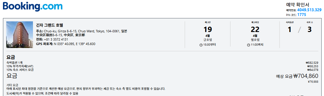실제 우리가 결제한건 3박에 70만원 정도! 이정도면 긴자에서 가성비 호텔이라고 볼 수 있다! 물론, 이때 엔화가 지금보다 더 낮아서 그랬을수 있다고 생각한다. 그래도 엔화가 1000원이라고 잡아도 약 76만원 선이니까 나쁘지 않은 가격이라고 본다.